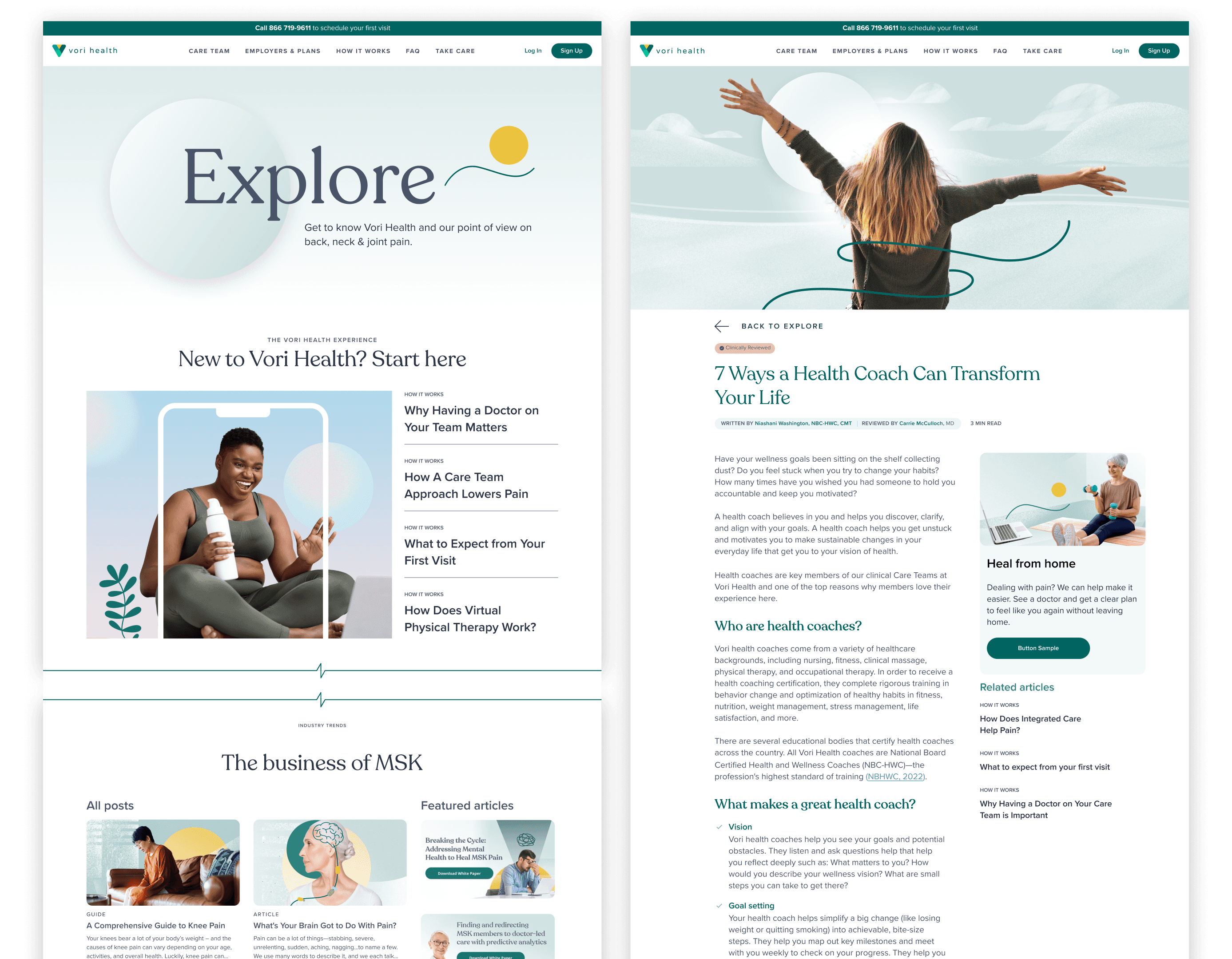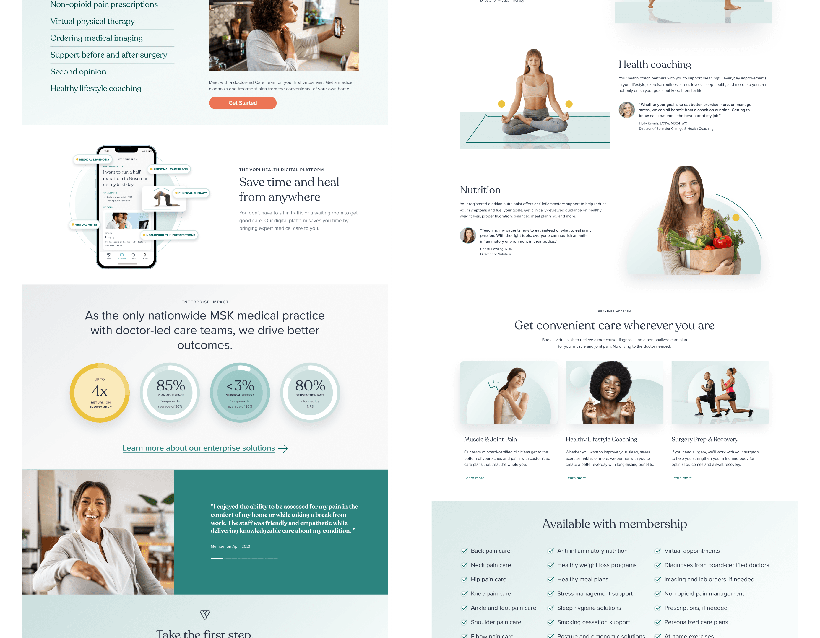 Vori Health needed more than just a website; they required a complete brand identity. Initially, they only had a logo and a clinical vision, so I developed their entire minimum viable product (MVP) identity from scratch. The first version emphasized warmth, clarity, and simplicity, aiming to make patients feel safe as they learned about a new model of musculoskeletal (MSK) care. It featured friendly shapes, soft colors, and a straightforward user experience to quickly build trust.